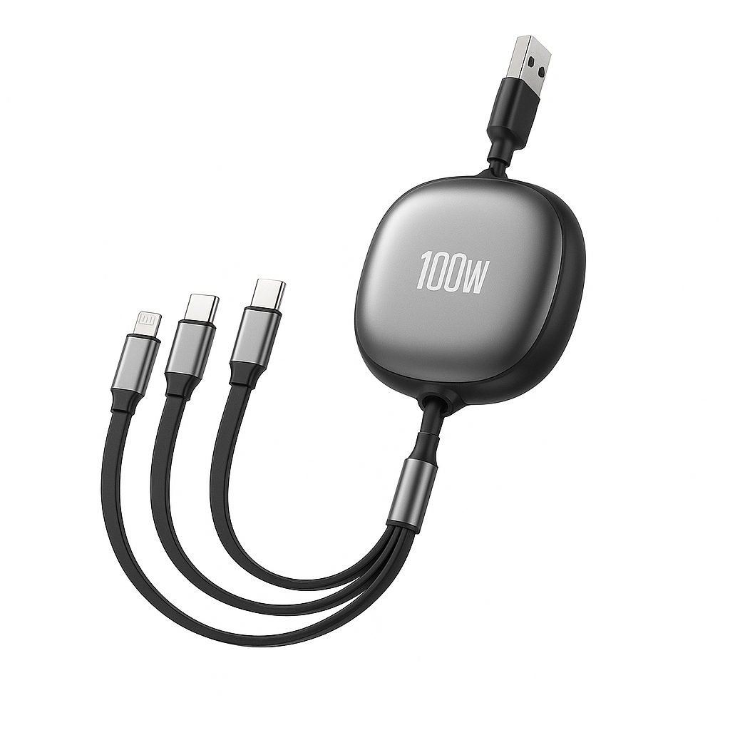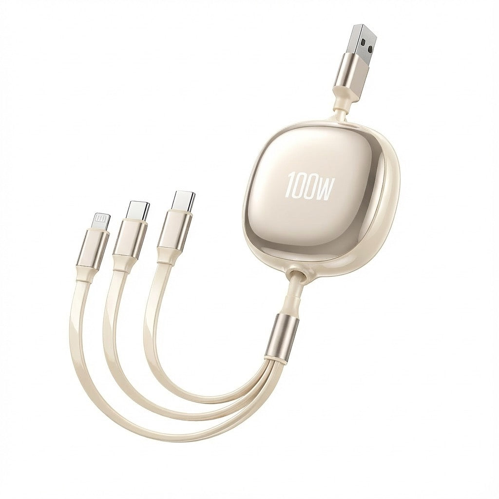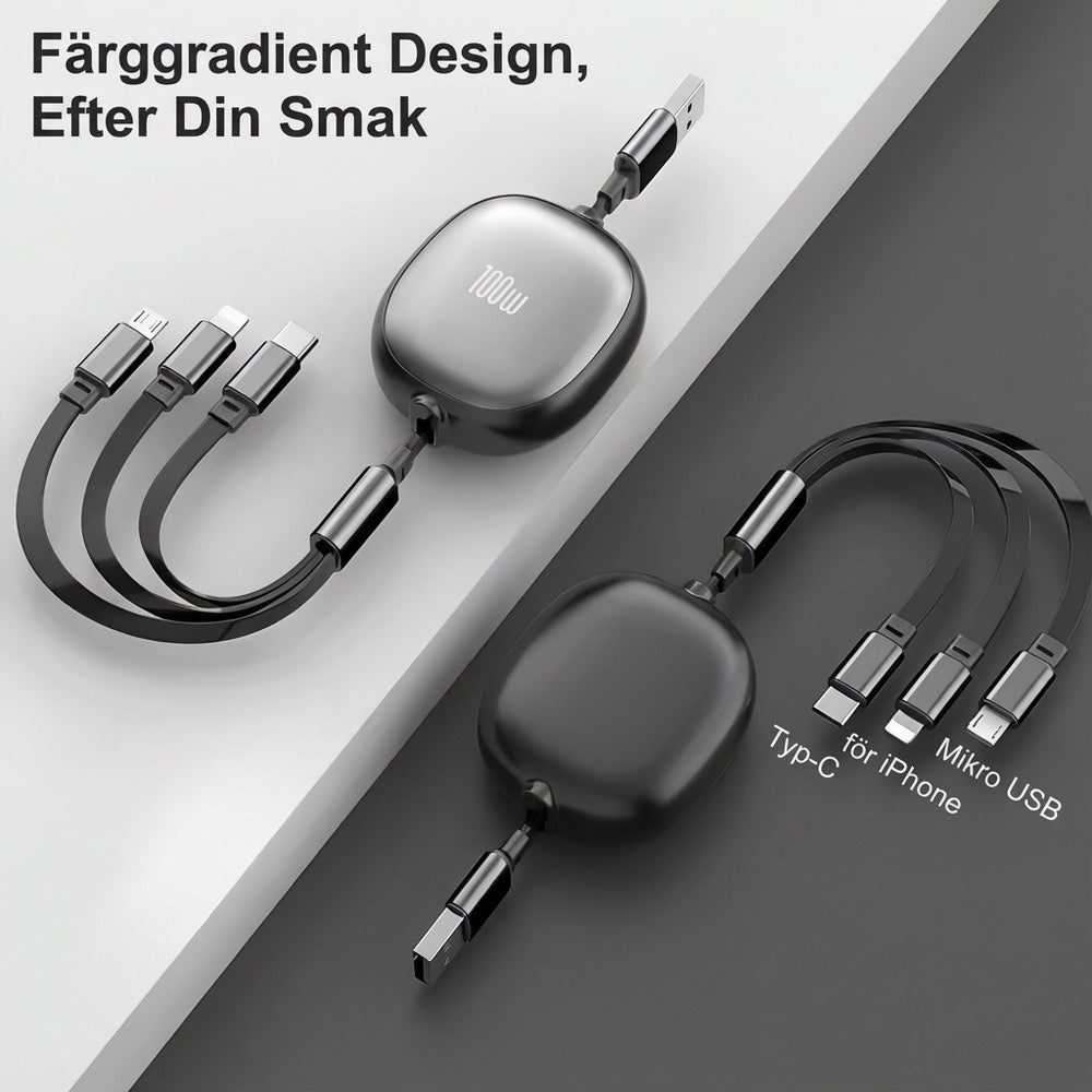 Vår 100W steglöst utdragbara 3-i-1-kabel gör laddning enkel, snabb och organiserad. Utdragningen sker jämnt från båda sidor, vilket gör att kabeln aldrig trasslar. Du får tre portar i samma kabel: USB-C, Lightning och Micro-USB, så du kan ladda nästan alla dina prylar samtidigt.