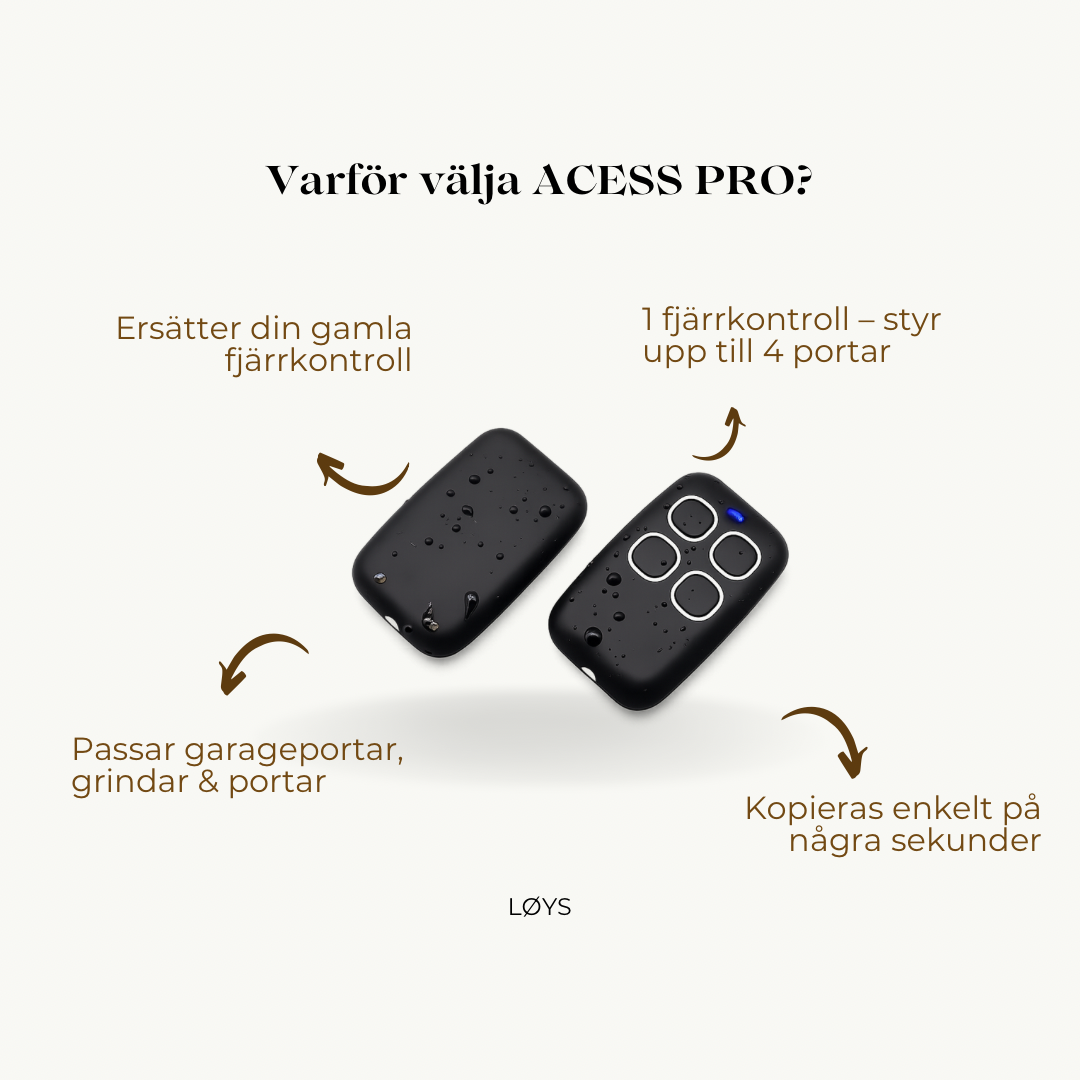 ACESS PRO är en smart, kopierbar universalfjärrkontroll som ersätter många olika fjärrkontroller till garageportar, grindar, portar, bommar och andra RF-styrda system.