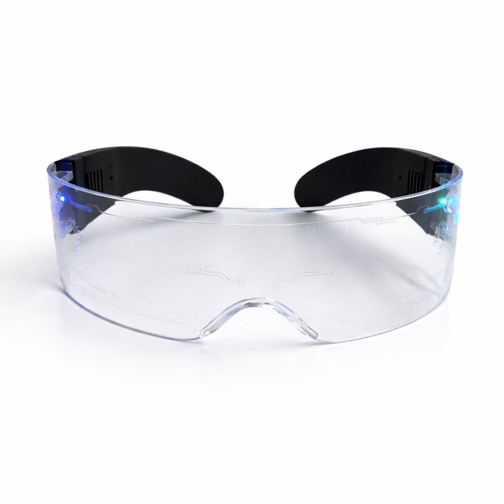Två kraftfulla LED-ljus på varje sida förstärker den futuristiska cyberpunk-looken. Ljuset sprids genom linsen och skapar en stark neon-effekt som syns direkt i mörker och festmiljö.