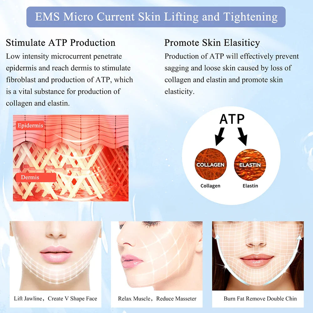 EMS vibrations takes advantage of low faradic currents that it delivers to the skin which stimulates all the nerve endings which causes the face muscles to contract and relax at recurring intervals. It's that stimulation that tones and tightens your skin while reshaping your face! It also burns excess fat in your face to help define the v shape line.