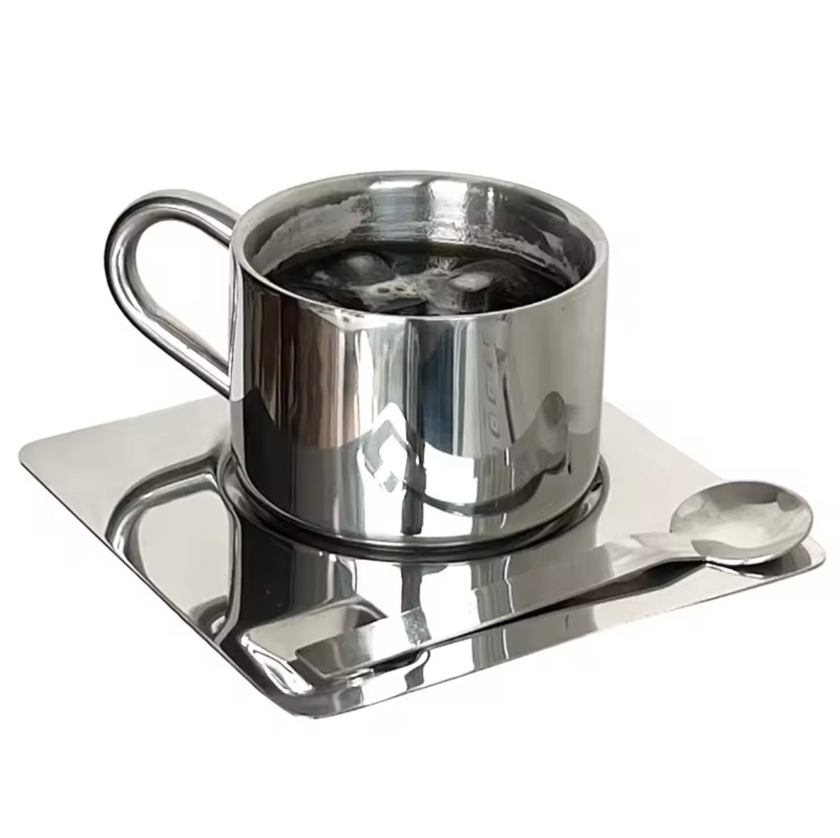 STÅL - 3-delars Kaffekoppset i Rostfritt Stål med Fat och Sked
